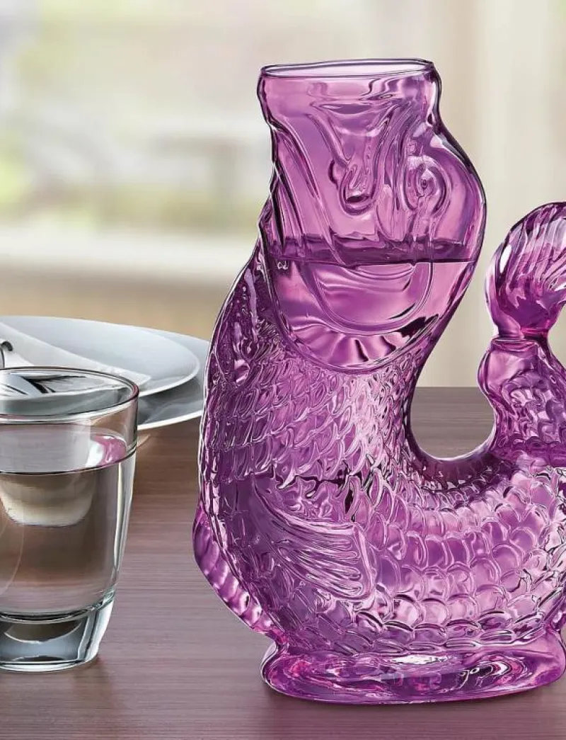 Borosilikatglas, handgjord, bred hals för enkel påfyllning och tillsättning av isbitar, fiskstjärtshandtag för ett säkert grepp, ett glatt kluckande ljud uppstår vid upphällning.