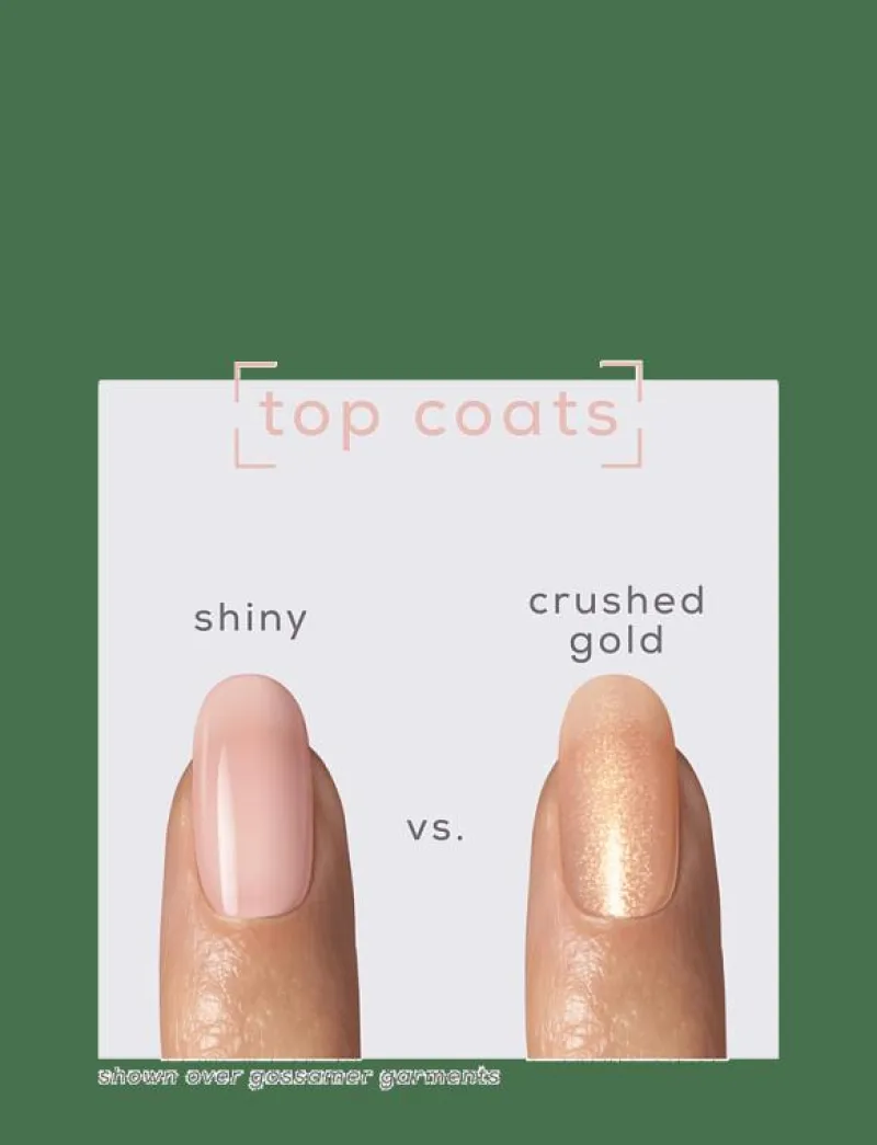 LÄTT ATT LÄGGA & TA BORT Gel-manikyr hemma i endast 2 enkla steg:Steg 1. Applicera 2 lager gel couture by essie long-lasting nagellack. Underlack behövs inte.Steg 2. Applicera 1 lager gel couture by essie metallic glaze överlack för glittrande, iriserande eller sidenblank glans. UV-lampa behövs inte. Lägg på nytt överlack på dag 7.Enkel, skonsam borttagning: använd nagellacksremover med eller utan aceton. Du behöver inte skrapa eller blötlägga naglarna.
