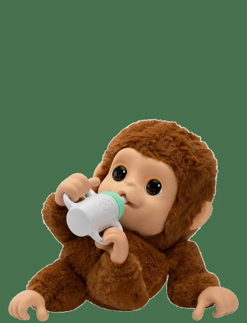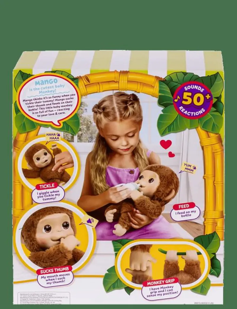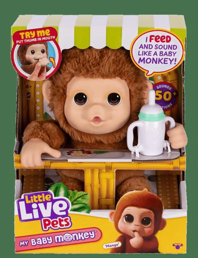 Little Live Pets My Baby Monkey is waiting for someone to love, care & play with him. With an adorable soft-touch face and soft fur, kids will love to hold and cuddle Mango! This Little Live Pet acts and reacts just like a real baby monkey. Mango has over 50 sounds and reactions as your child interacts with this amazing interactive plush monkey! My Baby Monkey has an expressive moving mouth as he sucks his thumb or feeds himself from his bottle. Tickle Mango’s belly to hear him giggle! Mango has a strong grippy hands, allowing him to hang onto things just like a real monkey!
